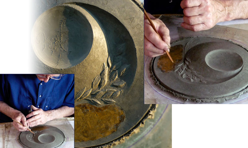 Travail de finition à la main avec des échoppes, des burins et des ciselets. L’idée est d’enlever les traces de la machine et de venir donner de la vie à la future médaille.