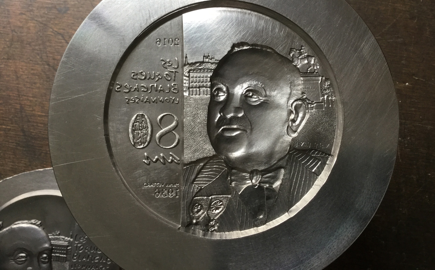 La face est modelée : avec le portrait de Marius VETTARD, en fond la place Bellecours, le Cheval et Louis XIV, sculpture de Lemot et en fond la colline et Fourvière. Sur le bandeau, les 80 ans de l’association.