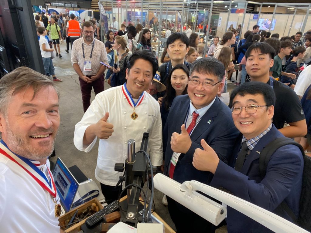 Rencontre de la délégation coréenne des WorldSkills. Nous échangeons sur le concours Un des Meilleurs Apprentis de France, et MOF. Nous partageons des valeurs communes qui nous relient. Nous parlons du 6 au 9 Juin 2024 qui réunira les finales nationales MAF, avec quelques 120 métiers à la cité internationale en plein cœur de Lyon.