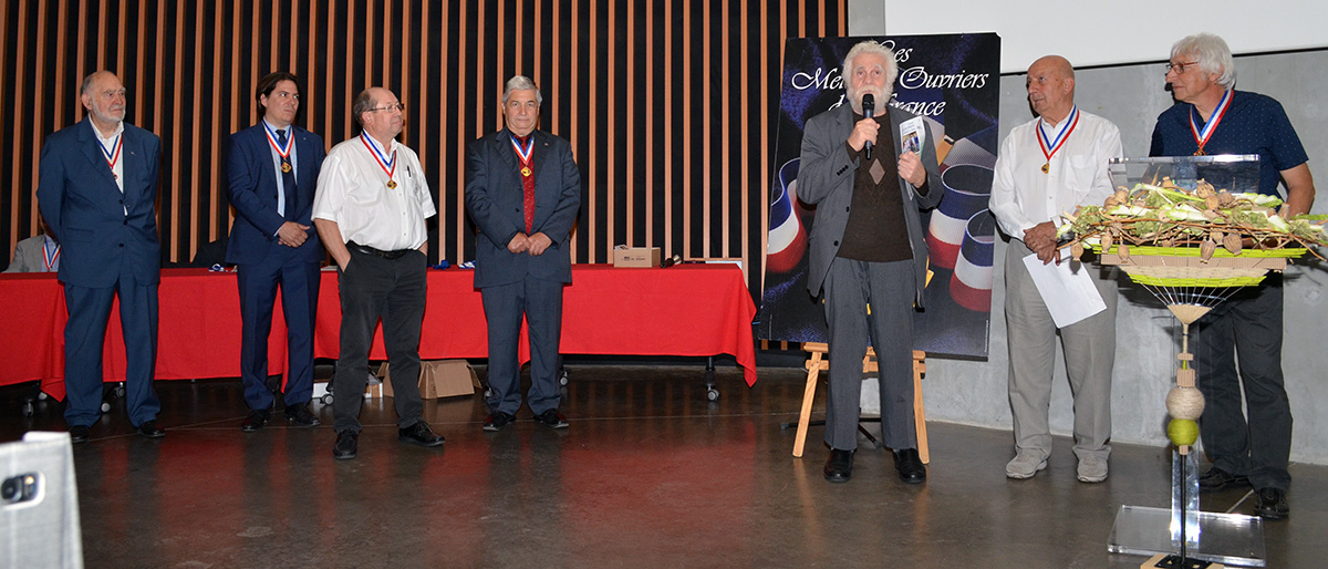Frédéric Gaudette, président des MOF de la région Auvergne-Rhône-Alpes, Gérard Cartet, président des MOF du Rhône, Bruno Vessella, représentant Véronique Furlan responsable de la SEPR, et Hervé Brun, adjoint au Maire du 6ème de Lyon ouvrent cette cérémonie.